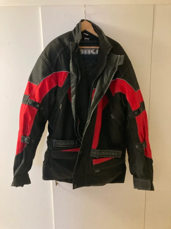4Bike allvädersjacka i svart och röd kraftig textil i storlek 58/60. Jackan har hög krage och front med dragkedja och knappslå. Kraftig och tålig modell som knapp är använd.