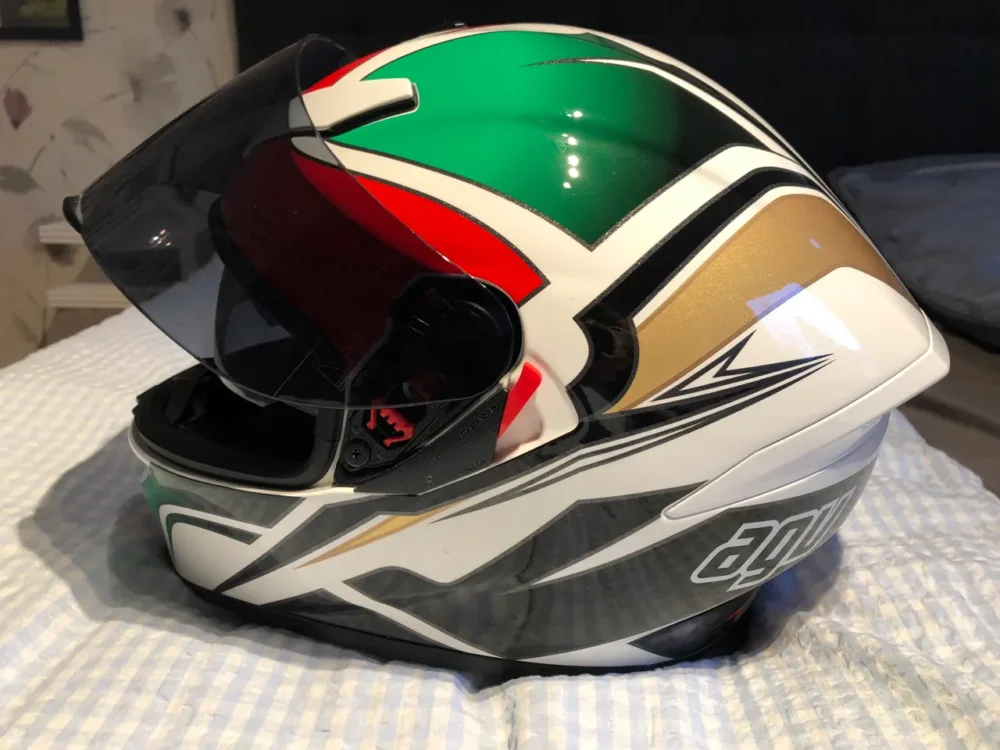 AGV integralhjälm med visir i flerfärgad design med grönt, rött, vitt, guld och svart mönster. Hjälmen har heltäckande skal och klart visir, stl m-L
