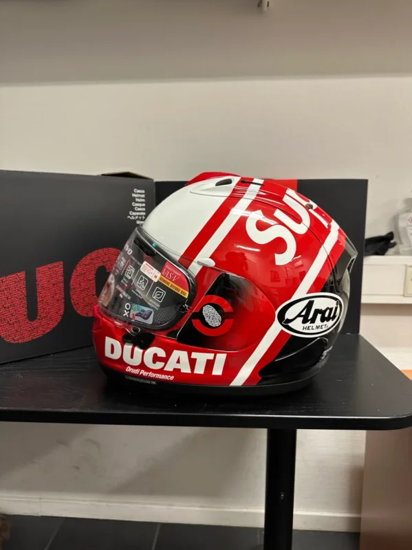 Helt ny och oanvänd Arai Ducati Supreme integralhjälm i röd och vit färg. Size M (57-58)