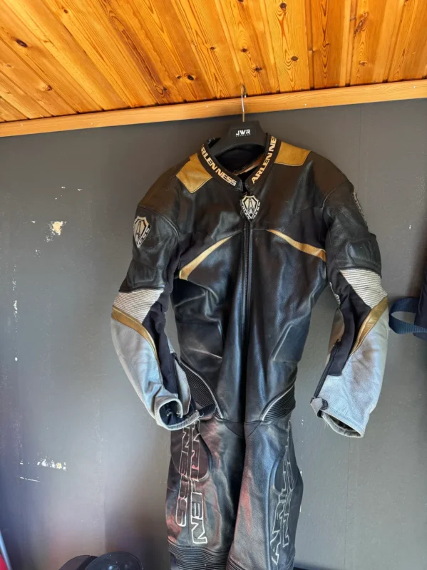 Klassiskt race-ställ från Arlen Ness , guld , svart och silver , live on the edge logga på ryggen.