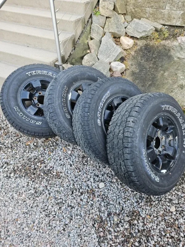 I princip nya Terramax Sailun A/T 265/70R15 däck med fälgar.