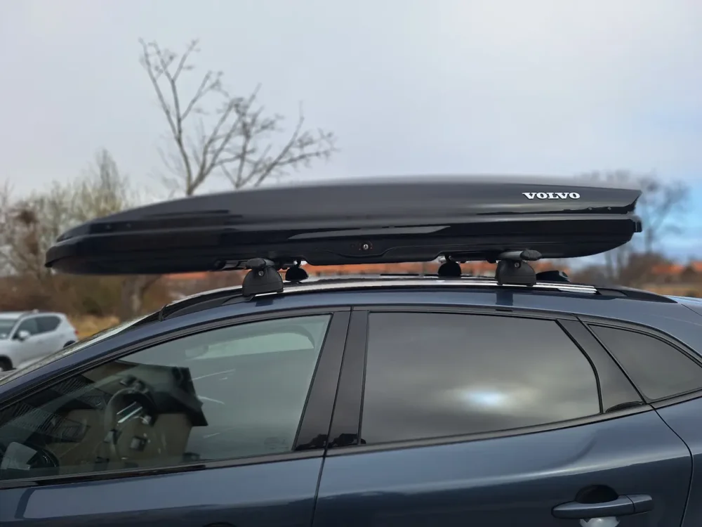 Volvo takbox i svart utförande. Monteras på takräcke med fästen som syns på bilderna. Invändigt finns lastytor och spår för lastremmar. Passar för extra bagage på bilens tak, till exempel vid resor eller transporter där mer lastutrymme behövs.