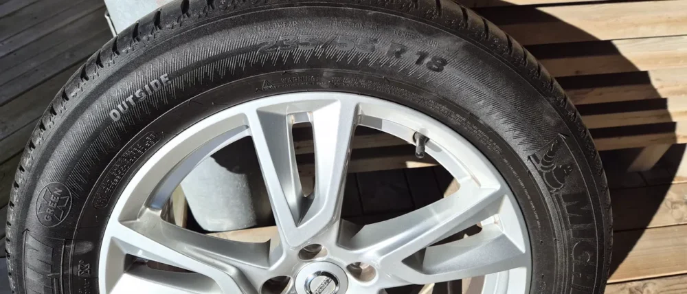 Volvo original fälg 18\\u201D. På fälgen sitter2 Michelin och 2 Continental sommardäck. Däcken är 235/55 R18 och har 4,5- 5 mm mönsterdjup kvar.