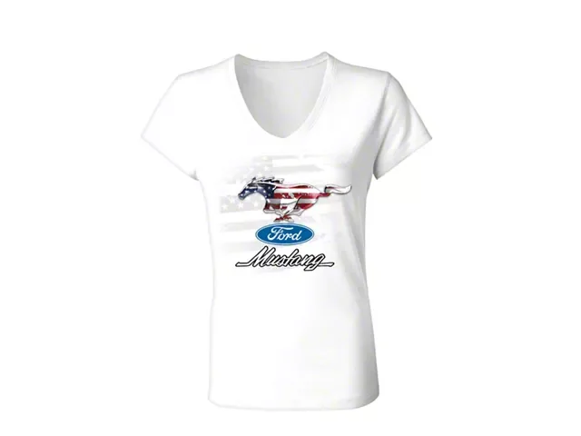 Women's Mustang T-Shirt American Stang; XXL: White Short Sleeve V-Neck T-ShirtRunning Pony American Flag DesignMachine WashableOfficially Licensed Ford ProductAvailable in Women's Sizes | Artikelnummer: 417499E | Motsvarar artikelnnummer: 417499E