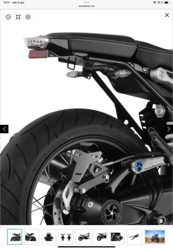 Wunderlich registreringsskyltshållare i svart metall. Kitet innehåller hållare och monteringsdetaljer enligt bilderna. Avsedd för montering bak på motorcykel för infästning av registreringsskylt och bakljus/blinkers beroende på modell. Inklusive Tail conversion LOW. Aldrig monterat. Passar BMW R Nine T Pure 2017 mfl.